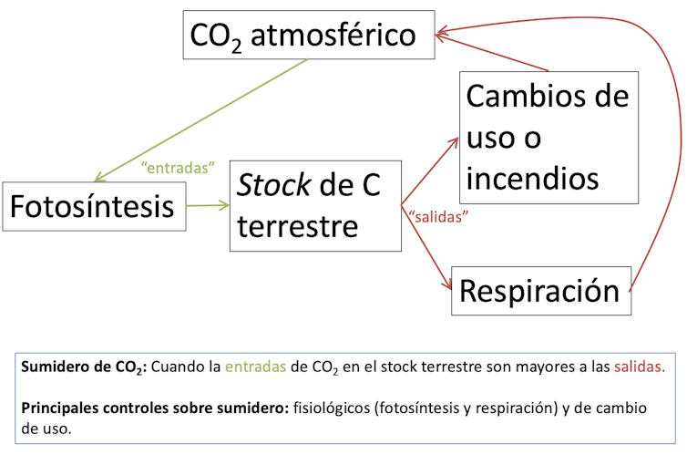 El sumidero terrestre es más complejo (fig. 1) y depende de las interacciones entre procesos fisiológicos como la fotosíntesis y la respiración, y del uso de la tierra y los incendios.